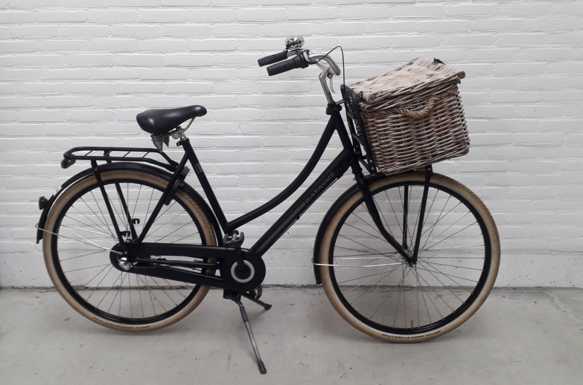 Zeer nette gebruikte Batavus Packd damesfiets/ transportfiets met basil mand op de voordrager.